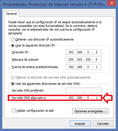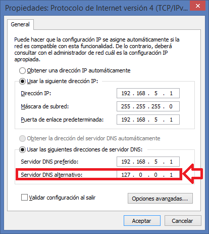 Lo importante está en que en Servidor DNS alternativo debemos cambiarlo, si es que tiene algún valor a 127.0.0.1